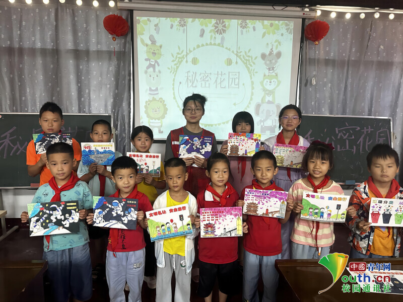 (图为支教队成员与孩子们上美术课展示成果。中国青年网通讯员喻文洁供图)