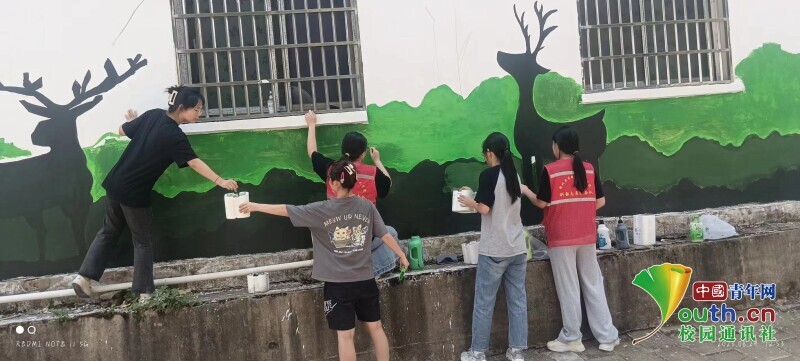 (图为支教队成员运用自己的专业特长开展墙绘。中国青年网通讯员喻文洁供图)