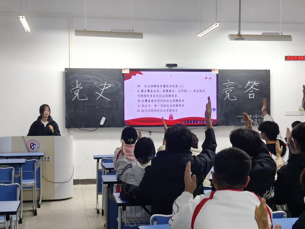 手抄报比赛紧扣“党史事件+红色人物+交通元素”为主题;书法比赛征集党史名言与红色诗词原创作品。两项活动收获大批兼具思想性和艺术性的佳作,生动展现了新时代青年对红色精神的理解与传承。党史知识竞答以“以赛促学”为核心,依托“学习强国”APP学习积分排名选拔选手,竞赛题目从200道题库中精选。11月30日,决赛在诚志楼317教室举行。赛场上,选手们凭借扎实的党史知识储备展开精彩角逐,充分展现了青年学子的理论素养与精神风貌。
