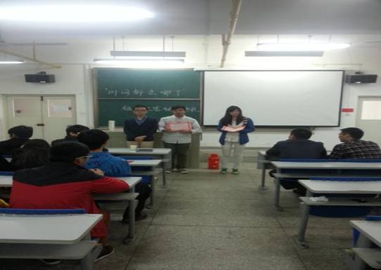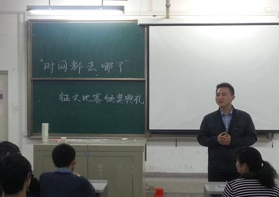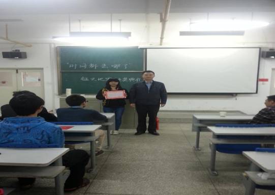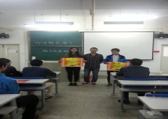 3月31日中午12:30在G516举行了“时间去哪儿了”征文比赛颁奖典礼,出席本次颁奖的嘉宾有公路与轨道学院分团委书记张鹏老师、大一辅导员成淑芬老师。