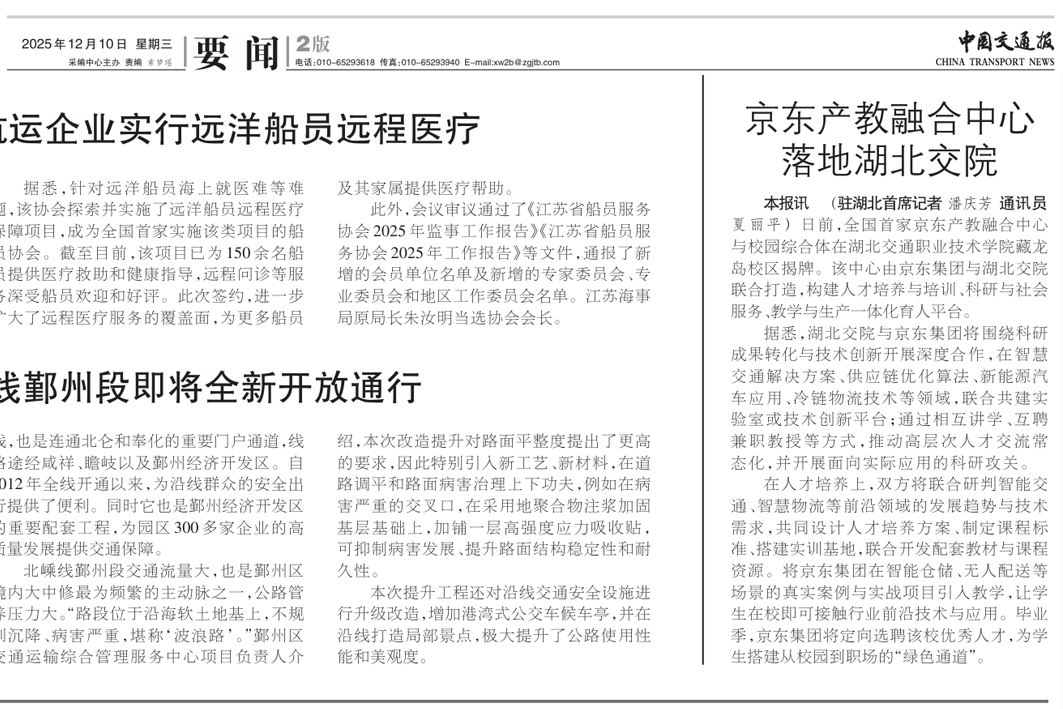 本报讯(驻湖北首席记者潘庆芳通讯员夏丽平)日前,全国首家京东产教融合中心与校园综合体在湖北交通职业技术学院藏岛校区揭牌。该中心由京东集团与湖北交院联合打造,构建人才培养与培训、科研与社会服务、教学与生产一体化育人平台。