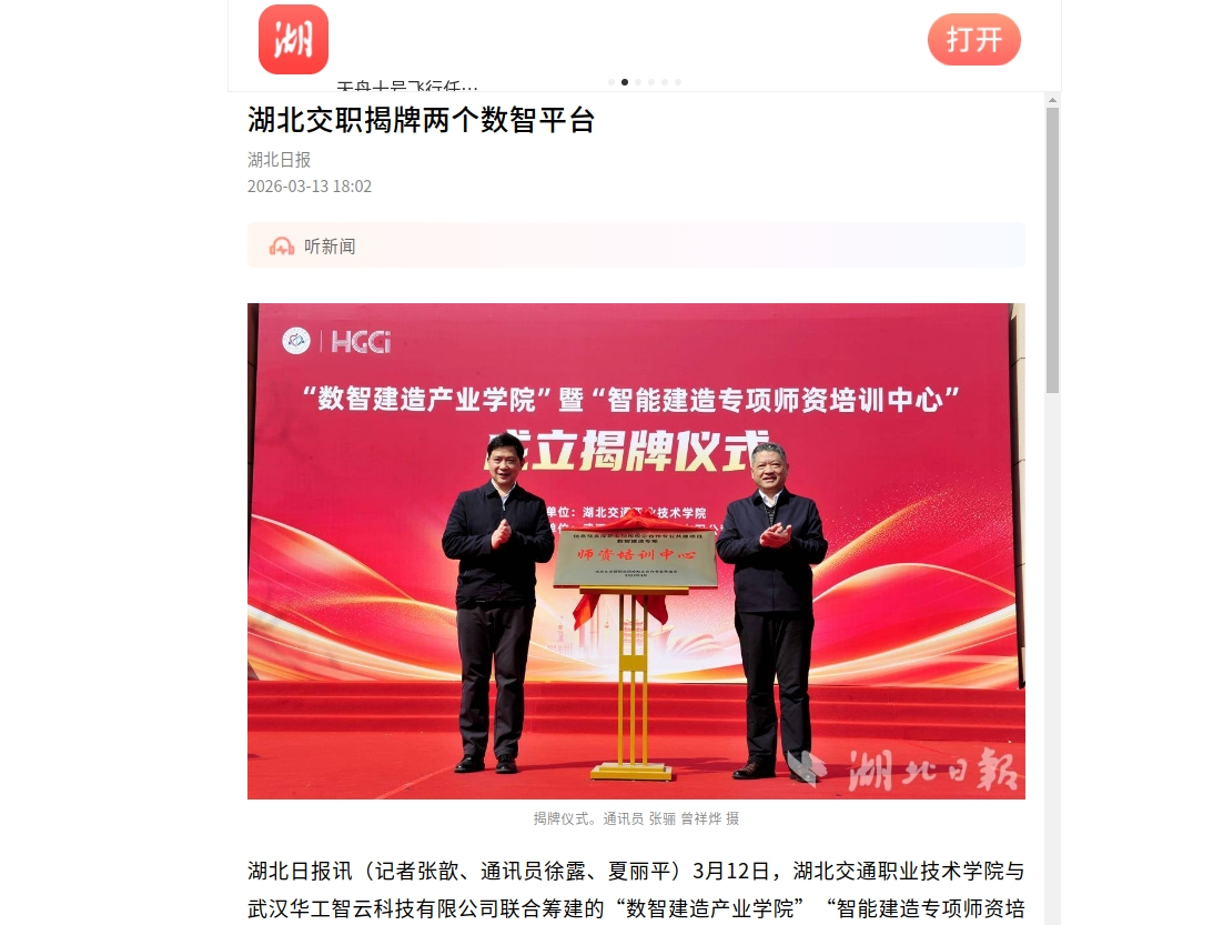 湖北日报讯(记者张歆、通讯员徐露、夏丽平)3月12日,湖北交通职业技术学院与武汉华工智云科技有限公司联合筹建的“数智建造产业学院”“智能建造专项师资培训中心”正式揭牌。