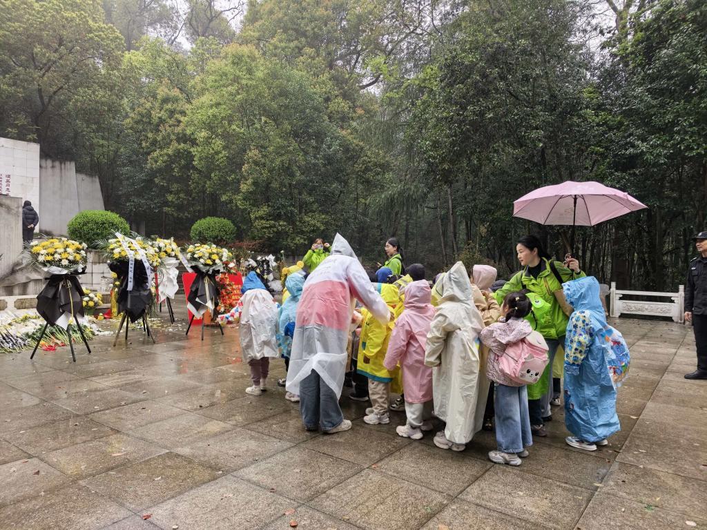 活动当天,志愿者们提前到岗,在工作人员统筹下分为三组,分工明确、坚守岗位。纪念馆内,他们轻声引导群众文明参观,重点帮扶老人、孩童;台阶沿线,针对雨天路滑隐患,反复提醒安全、疏导人流;项英广场,他们协助维护仪式秩序、搬运物资,细雨中的“青春志愿红”成为纪念馆最动人的风景。