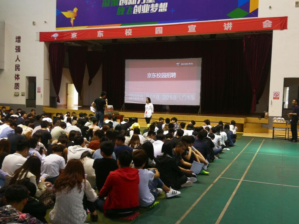 京东公司的宣讲会由有奖互动活动开始,京东logo的卡通玩偶也是最受热捧的会场吉祥物。会上,京东公司代表陈浩通过制作精美的PPT介绍了京东公司的整体信息、人才需求及员工福利,吸引了大批同学的关注度。
