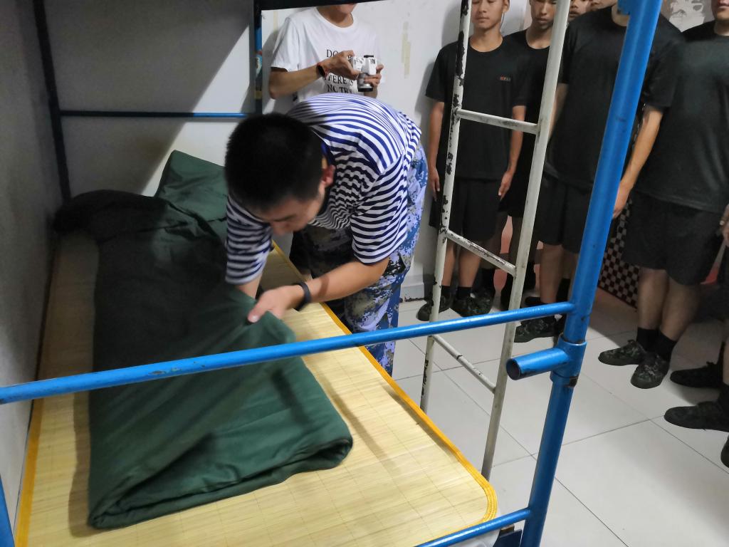 “被子可以三折,也可以四折,大家来看我示范一下。”教官在检查的过程中就新生宿舍中被子的折叠、摆放、整理对新生进行了详细讲解,此外,对宿舍中生活用品的摆放,床铺的整理和地面的清洁也提出明确标准和要求。同学们专心听教官讲解,认真看教官作示范,看着软塌塌的被子变成了豆腐块,水杯犹如战士军姿一般整齐划一,地面也变得干净整洁,大家纷纷表示,这样整理内务以后寝室的生活学习空间似乎变大了,所有物品的摆放、井井有条,心情也变得简单明快起来。
