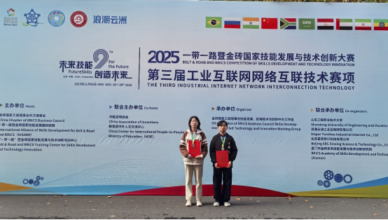 11月6日-9日,2025年一带一路暨金砖国家技能发展与技术创新大赛之第三届工业互联网网络互联技术总决赛在山东工程职业技术大学圆满落幕。经过激烈角逐,我校交通信息学院代表队取得全国二等奖的好成绩。同时,学校凭借周密的组织保障与出色的参赛成效,荣获“优秀组织奖”。