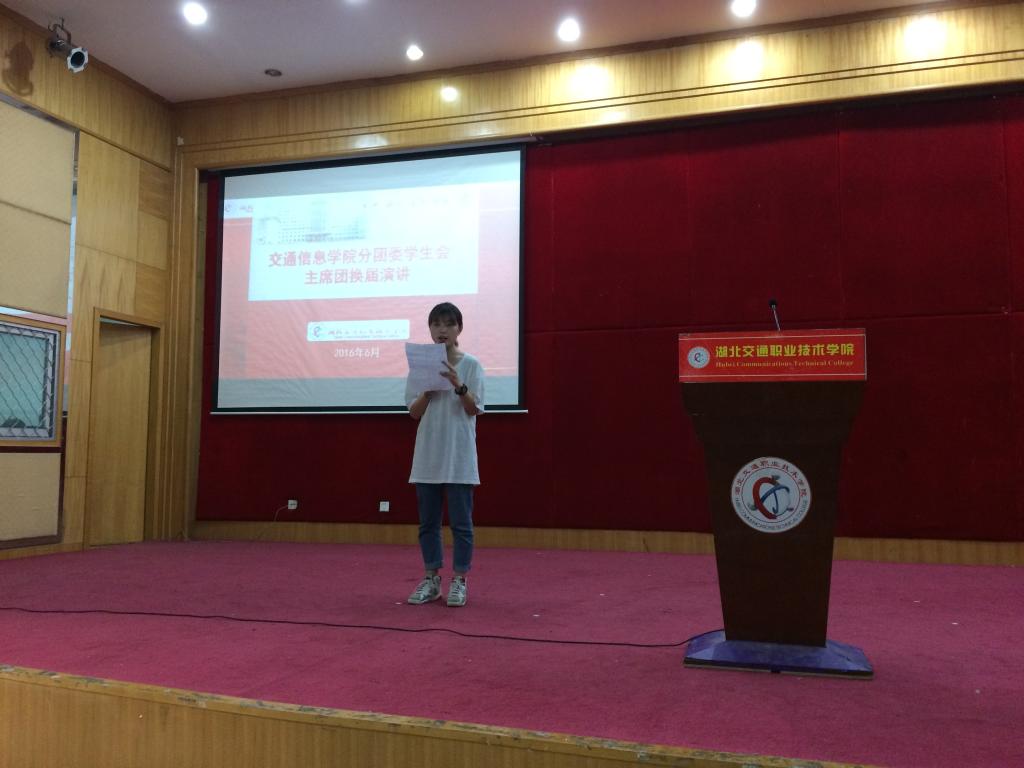 2016年6月6日18:30,交通信息学院学生会主席团换届选举在A栋五楼学术报告厅顺利召开。出席此次的嘉宾有分团委书记刘桥老师、16届辅导员田红雨老师、15级分团委副书记周楠瑾、学生会各部们部长及干事,参加活动的还有交通信息学院15级全体班长和团支书。换届选举会由现任主席谭鑫濛主持。