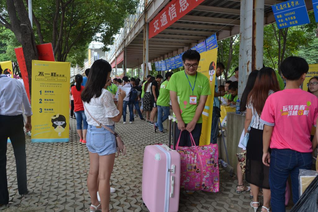 9月5日是湖北交通职业技术学院2016级新生的报到日,为了使每一名新生都能顺利地进入,交通信息学院的70名迎新志愿者从5日中午开始了为期两天半的迎新工作。这些志愿者是由交通信息学院15级学生会干部、社联干部及各班级的优秀学生组成,他们分布在不同的岗位,承担着不同的职责,却有着同一个目标:奉献自己的力量,让16级的学弟学妹们能安全顺利的进入到“湖交”这个大家庭。