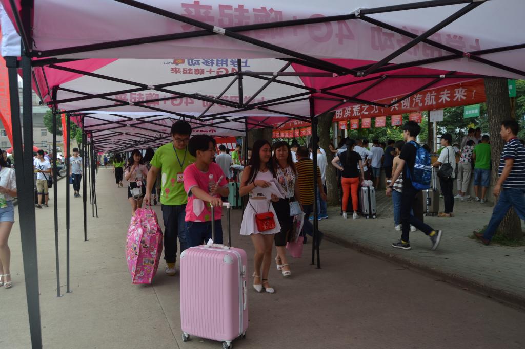 这两人是交通信息学院的志愿者徐泽伟和金宇辉。他们的工作是负责在学校南北门接待新生及家长,并引导至对应的学院迎新点处。一上午就看他们分别引导了10多次,每一次带领的新生不同,帮忙拿的行李也或大或小,但是他们脸上的笑容,额头上的汗珠,还有对新生和家长们热情而又耐心的服务却都是一样的。