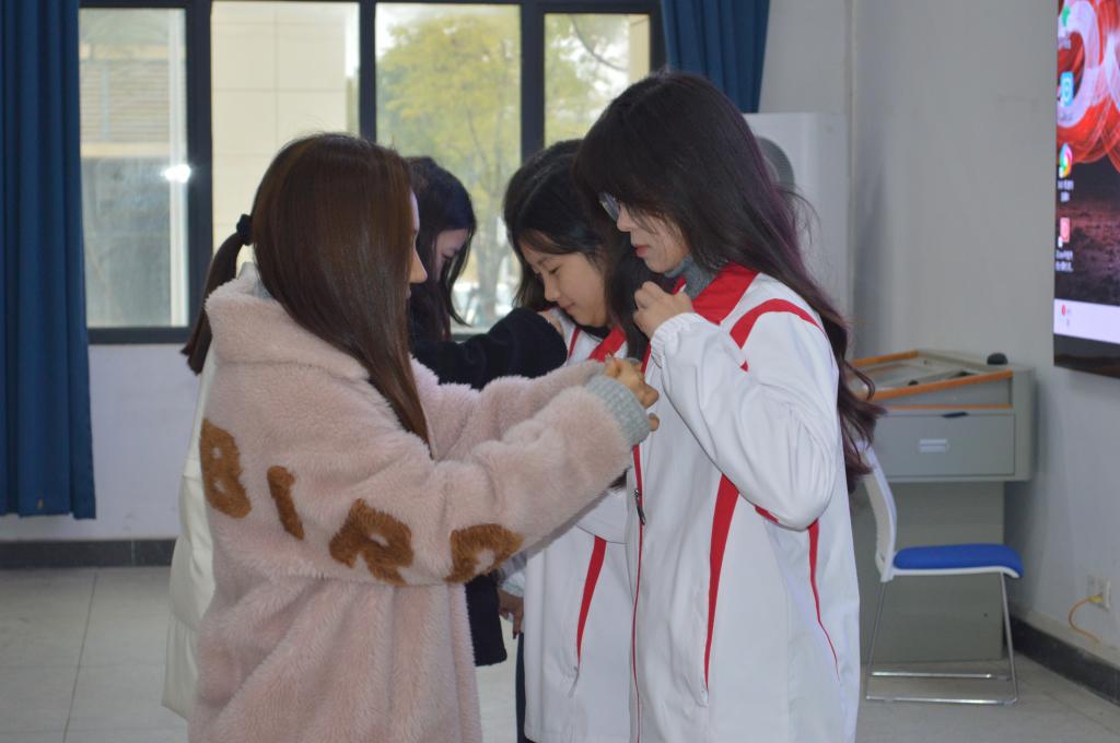 仪式在庄严的国歌声中开始。学院组织部负责人杜琪宣读了新发展团员名单。随后,与会老师们为优秀团员代表佩戴团徽。