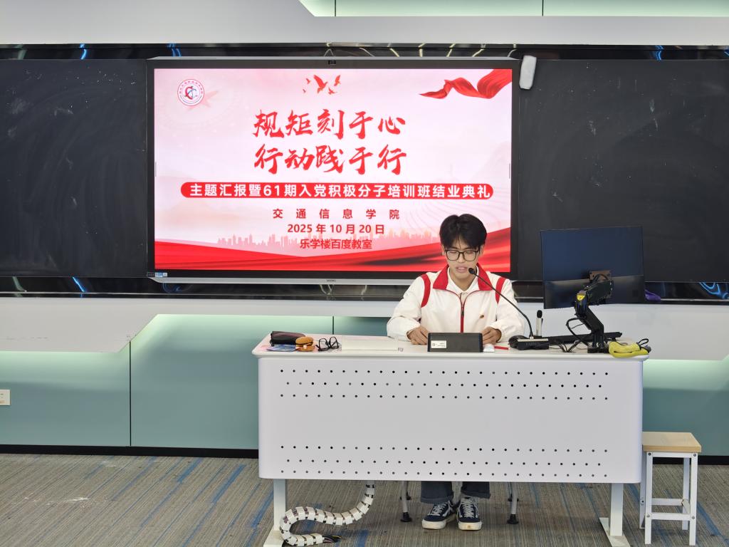 10月20日中午,交通信息学院在乐学楼110教室举行第61期入党积极分子培训班结业典礼。学院党总支书记梅晶、学生党支部书记黄河恋、学生党支部支委及24名入党积极分子参加了本次活动。
