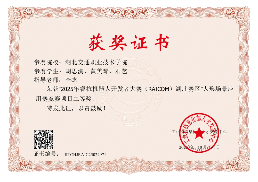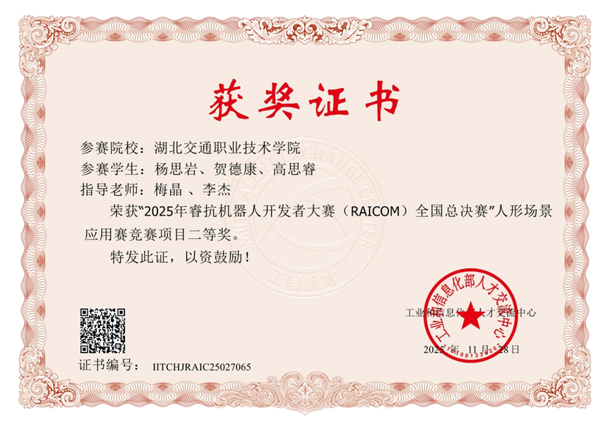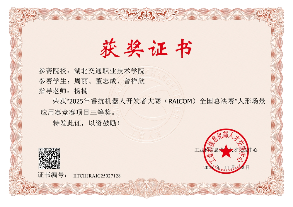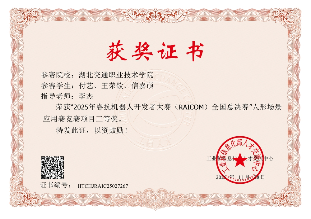 1114日至16日,2025年睿抗机器人开发者大赛(RAICOM)全国总决赛“人形场景应用赛”在杭州人工智能小镇圆满落幕。经历省赛激烈的角逐,最终有341支队伍进入全国总决赛,我校五支国赛参赛队伍,斩获全国一等奖1项、二等奖2项、三等奖2项,充分体现了我院的育人成效。