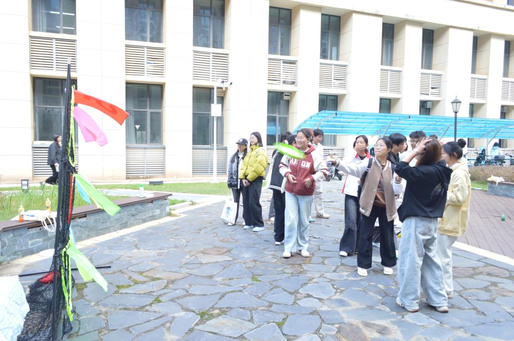 活动现场气氛热烈,五大特色项目依次排开,吸引了众多学生驻足参与。“疯狂指压板”上,同学们忍着足底的酸胀完成任务,在欢笑中释放压力;“跳绳大作战”里,绳子飞舞的节奏与青春的心跳同频,每一次跳跃都充满活力;“爱的魔力圈”环节,大家互相配合投掷圆环,在协作中拉近彼此距离;“趣味羽毛球赛”弱化了竞技性,更注重互动乐趣,让同学们在挥拍间感受运动的快乐;“学长学姐的藏宝图”最具巧思,藏有暖心寄语与小礼物的“宝藏”被一一找到,学长学姐的经验分享为学弟学妹注入了温暖力量。