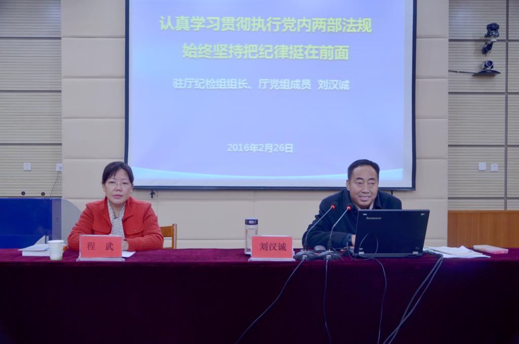 2月26日,厅直系统学习贯彻党的十八届五中全会精神和《准则》《条例》培训班在我校举行,厅机关党支部书记、厅直单位党委书记、纪委书记、党办主任、基层党支部书记80余人参加了培训。培训班特邀驻厅纪检组长刘汉诚、武汉大学邹金堂副教授作专题辅导报告。培训班由程武副厅长主持。