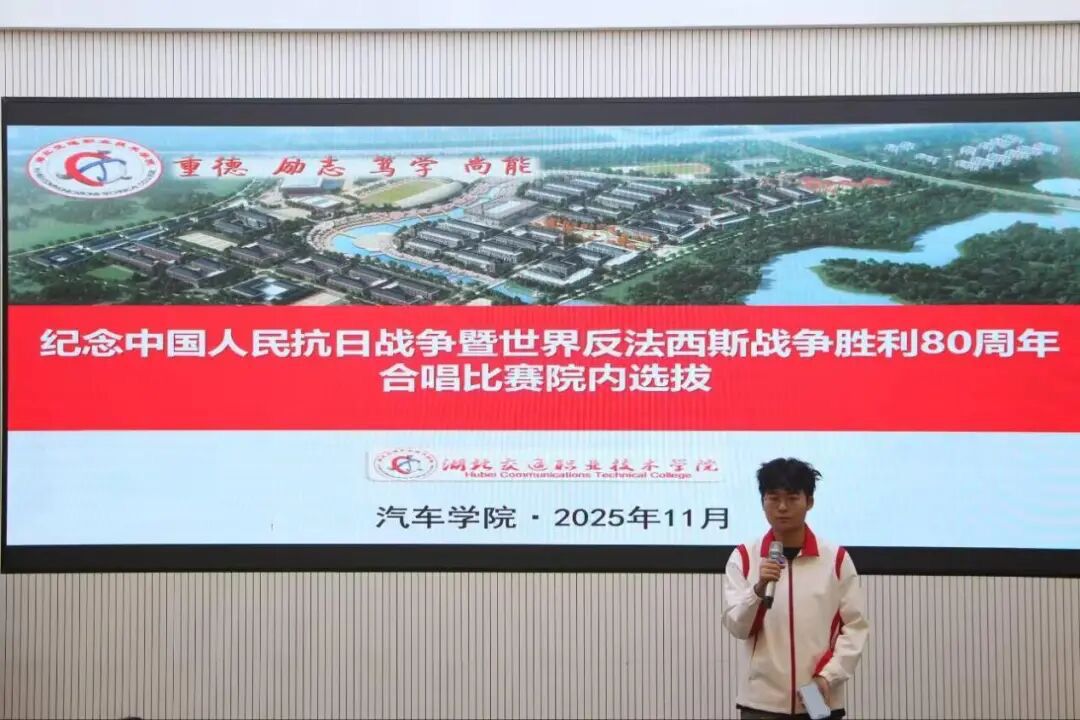 为深切缅怀革命先烈,传承红色基因,铭记中国人民抗日战争暨世界反法西斯战争胜利的光辉历史,11月13日,汽车学院“一站式”学生社区隆重举办以“铭记抗战历史,传承红色基因,凝聚奋进力量”为主题的合唱比赛。来自各年级的13支参赛队伍齐聚赛场,用激昂的歌声、真挚的情感演绎红色经典,致敬革命岁月,展现新时代青年的爱国情怀与青春风采。