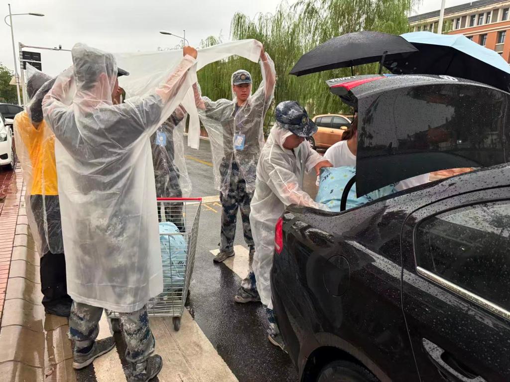 尤其令人动容的是,当天下午恰逢降雨,为了不让新生的行李被淋湿,汽车学院的志愿者们冒雨行动,坚持到最后一刻。他们有的撑着伞护送新生,有的脱下自己的雨衣盖在行李上,有的冒雨往返于报到点和宿舍之间,浑身湿透却依然笑容满面。这雨中的身影,不仅是汽院志愿服务精神的生动体现,更让新同学在初入校园时就感受到了家人般的温暖。