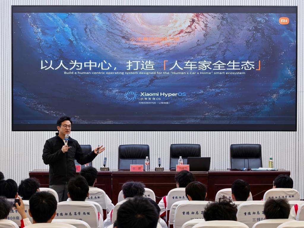 讲座中,企业代表从小米的使命、愿景与核心价值观切入,重点介绍了小米汽车板块的发展历程与文化积淀。主讲人特别引述了小米集团创始人关于“要对汽车这个百年赛道存敬畏之心”的深刻思考。整场讲座聚焦企业文化主线,既有战略高度,也有实践温度。