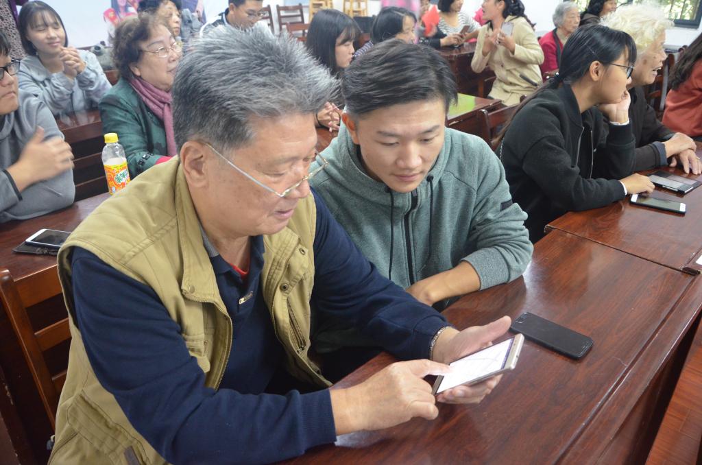 志愿者们配合省老年大学的张老师,通过集中讲解、一对一服务的方式,围绕老人们的兴趣爱好,介绍了智能手机的操作、聊天交流软件的使用以及购物网站的登录及操作流程。